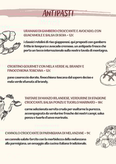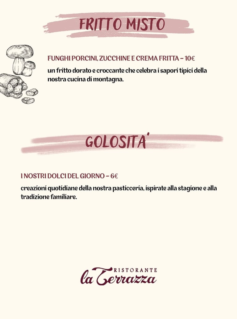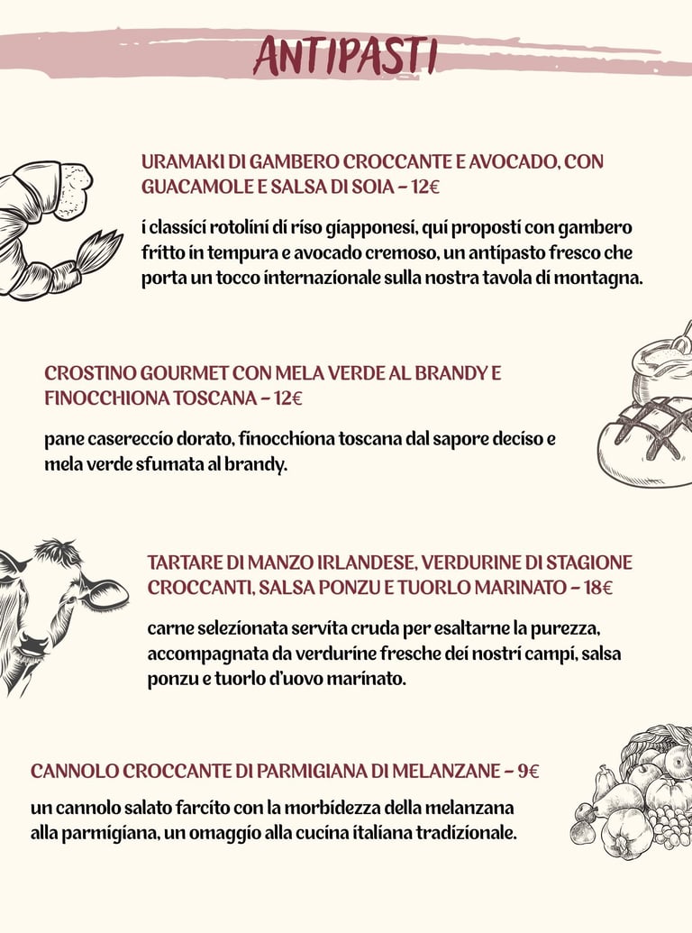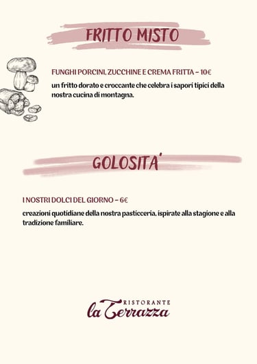 Il nostro menù si arricchisce in occasione di eventi speciali, con piatti dedicati che celebrano le tradizioni e i sapori del territorio. Ogni occasione è un’opportunità per vivere un’esperienza culinaria unica, accompagnata dalla splendida vista panoramica sulla vallata.
